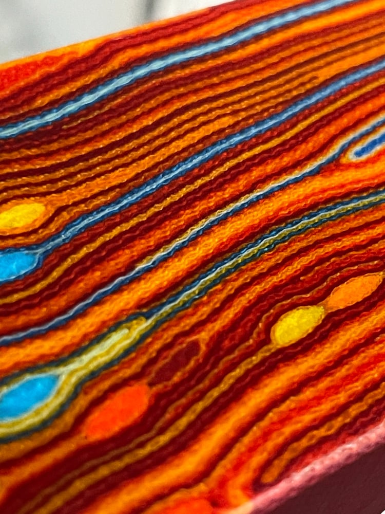 Multi colored fabrics make up this unique pattern